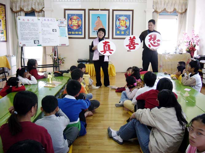 课程由学生自我介绍拉开序幕,除了每天固定的学法(《洪吟》、《论语》)和炼功时间之外,还安排许多艺术课程(如纸莲花制作、绘画、歌曲教唱、腰鼓介绍等)和英文、影片欣赏……,内容丰富多元,让学生在这一块与众不同的学习园地中,点点滴滴接受法轮大法的熏陶。