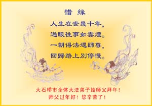 她给了我一本《转法轮》,她把印刷质量最好的一本给了我,我现在一直在用着。我读第一遍的时候,晚上熬夜读,家人看到了问读什么?我说读禁书呢!告诉他是《转法轮》,他说你可小心点别让别人知道了。第一遍因为带有好奇心理和很强的观念,总是在找这说的好这不对(后来才知道其实是不符合自己的旧观念),读完第一遍她又给我看了一篇师父新讲法,2002年3月份的吧(可能是《北美巡回讲法》)。第一遍《转法轮》读完我没觉得法轮功有什么不好,书上说修心性,不能杀生倒是看到了,而且要求真修者按照标准去做好人才是修炼。但其他也不是很清楚,就是觉得很好,但也有些不明白,后来我急切的问朋友怎么才是练啊?她教给了我五套功法。后来又看了第二遍书,看到要修心性,在平时修自己的心,按“真善忍”去做,这最重要,动作是辅助手段。第二遍读完后,我觉得确实应该做个好人,才能让自己心灵宁静,我也从心里想着要按照真善忍去做,但我开始读真善忍时觉得十分的别扭,我知道是受(政府的)媒体的宣传在思想中已经有了仇恨真善忍的观念了,我已经中了媒体宣传的毒了。但我后来明白真善忍是真正对的,我努力的排斥自己的坏思想,努力一点点的按“真、善、忍”去做。 刚开始我读“法轮大法好”时觉得很别扭,但到了今年的今天我读“法轮大法好”是发自内心深处的,是发自我生命的本源的。法轮大法好,真的好!而且我想起这些我就禁不住流泪,因为到今天才体悟到师父的慈悲与伟大!