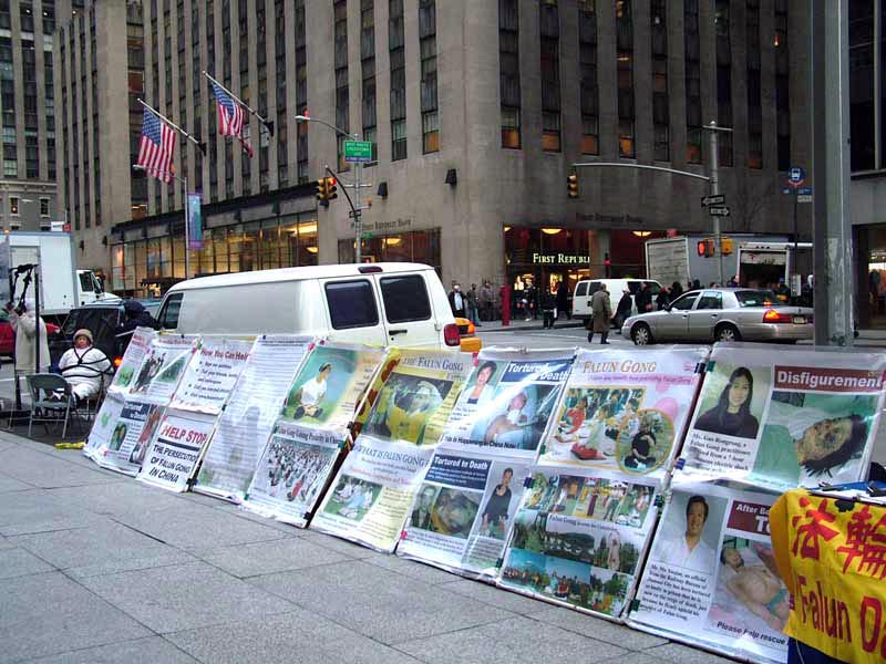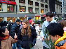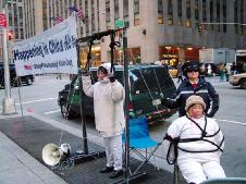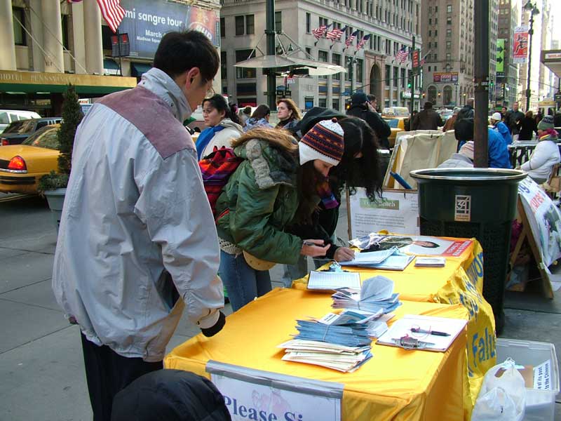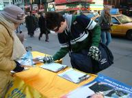 【明慧网2005年2月13日】2005年2月9日是中国农历的新年。在全球华人都合家欢度新年的时刻,来自世界各国的部分法轮功学员,仍然一如既往的坚持在曼哈顿向世人讲清法轮功真象。