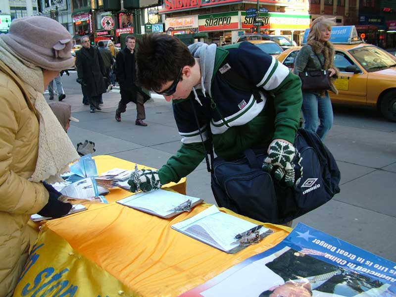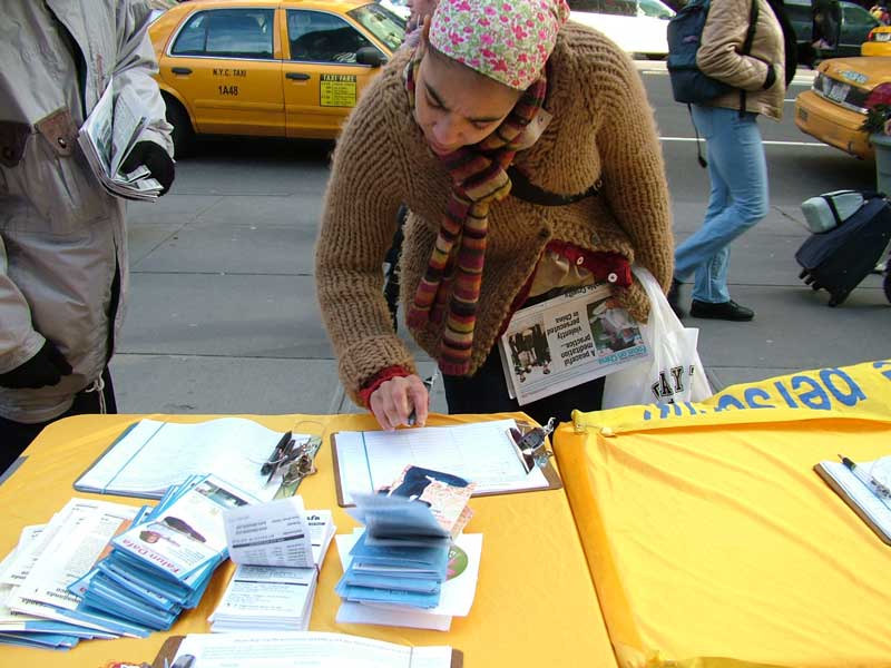 经常有人驻足签名台前,写下自己的名字,支持法轮功学员反