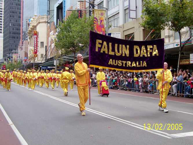 这是自中共江氏集团镇压法轮功以来,法轮功学员第一次高举法轮大法横幅加入在悉尼华人新年游行的队伍里。每年一度的悉尼华人新年游行是由悉尼市政厅统筹,筹委会由部分热心华人侨领及社区工作者组成。由于受中共谎言的欺骗以及害怕经济利益受到影响,法轮功连续5年来申请参加游行都没有获得批准,也没有得到任何合理的解释。今年筹委会对法轮功游行的申请口述了拒绝的理由:1、如果筹委会不拒绝法轮功参加,筹委会成员就拿不到回中国的签证。2、如果法轮功参加了游行,一个由中国来的与筹委会一起策划这次游行的表演队就会中途停止合作,那么新年游行就办不成了。3、你们应该与中共解决这个问题,而不是找我们解决。