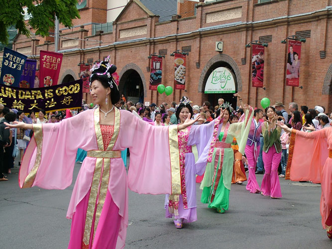 ![]() 首次参加悉尼华人新年游行的法轮功学员方阵 | ![]() 由法轮功学员表演的唐装舞蹈 |