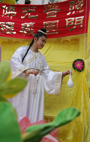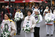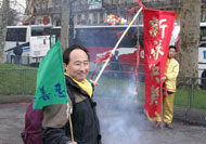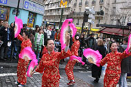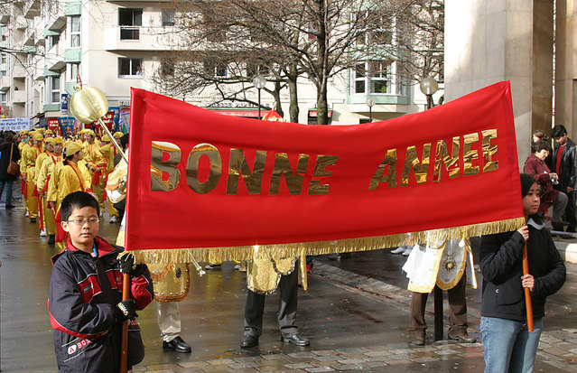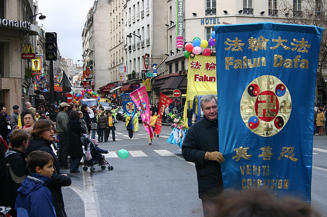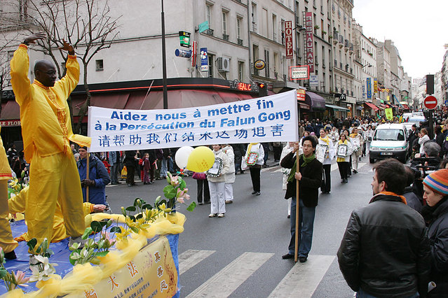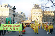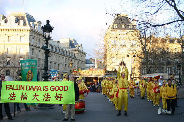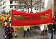 游行队伍由腰鼓阵、天女散花,扇子舞,莲花舞,唐装彩车,法轮功功法展示花车组成,鞭炮、锣鼓和优美的舞蹈向人们表达了法轮功学员对大家的新年祝福。同时,部分法轮功学员手捧在中国被迫害致死学员的照片走在游行的队伍中,告诉人们:在过年的喜庆日子里,在中国,修炼真善忍的好人正在遭受着酷刑与迫害,不能象大家一样阖家团圆,美满幸福的过年。
