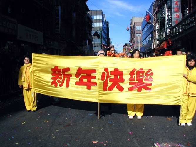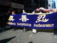 ![]() 游行队伍以“法轮功”开道 | ![]() “真、善、忍”横幅 | ![]() 问候大家“新年快乐” |