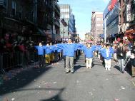 法轮功学员400人的游行队伍以“法轮功”开道,紧接着50人的功法表演队,学员们随着师父的口诀展示大法炼功动作的舒展美好。“真善忍”横幅接后。接下来是“新年快乐”横幅,龙腾狮跃,二龙四狮,为华埠的父老乡亲恭贺鸡年的到来。唐鼓旗风队,展示了唐朝文化雄浑仁义,包容四方的气度。仙女队翩翩起舞,展示大法弟子美丽柔和,高贵典雅的气质。最可爱的是明慧学校的小弟子们,纯真烂漫,诚恳的告诉世人“法轮大法好”。气势磅礴的腰鼓队再展雄风,英姿飒爽的鼓手们羡煞天兵天将。来自世界各地的大法弟子们手舞小旗“真善忍”、“法轮大法”向观众热烈的挥手,致意,表达新春的祝福。