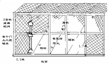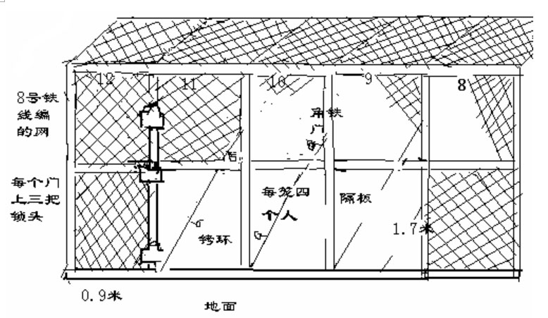 【明慧网2005年2月15日】这个铁笼子名叫“牌楼”(象山海关城楼似的),位于吉林省九台男子劳教所二楼警戒科,最里边自称禁闭室。这个铁笼子