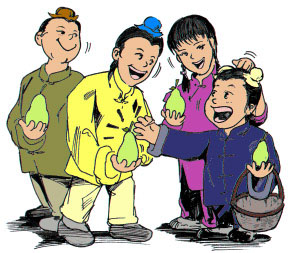 相传有一天,有人送来一篮梨子。他的哥哥们都挑大梨子,只有他挑了一个小梨子。别人问他为什么,他回答说:“哥哥年纪大应该吃大的,我的年纪小,不可和他们争。”