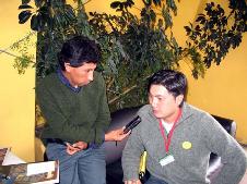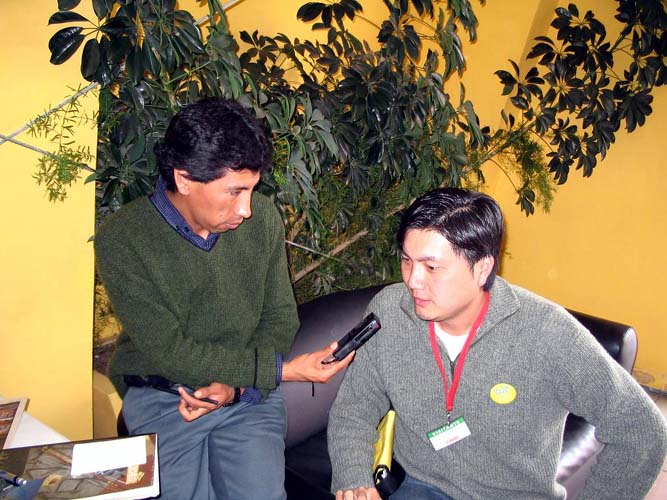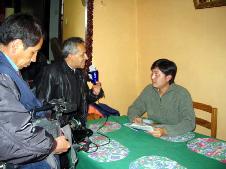 2月11日下午四点半,我们被邀请到了全国收听率较高的Fides电台。玻利维亚新学员弗拉迪米尔以自己的亲身经历告诉听众,学炼法轮功后自己开智开慧,学业成绩良好。主持小姐听了我们对法轮功的介绍后,告诉听众以她的理解认为真、善、忍比单纯炼功更为重要。我们的节目引起另外一位主持人的兴趣,她加入和我们一起兴致勃勃的谈论。原主持人说只给我们20分钟的时间,可是她和我们整整谈了一小时,兴致犹然未尽。电台采访结束后,我们回到旅店,受到18号电视台的采访。当主持人了解中共流氓政府镇压法轮功的真象后,主动邀请法轮功学员到18号电视台的演播室,向观众展示五套功法。