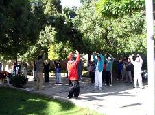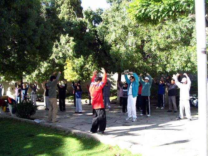 星期六上午,我和Gilberto八点前到了广场的炼功点,只见约有四十个人等候着我们前去教授法轮功。这批人还没走又来了几个要学法轮功的有缘人。当第二批15个初学者认真在学炼法轮功动作的时候,有18号电视台和2号电视台的记者前来采访。记者感受到了这平和,安详的正念之场,情不自禁的也和大家做着法轮功的动作。2个电视台的记者非常满意的结束采访,并告诉我们播放的时间。