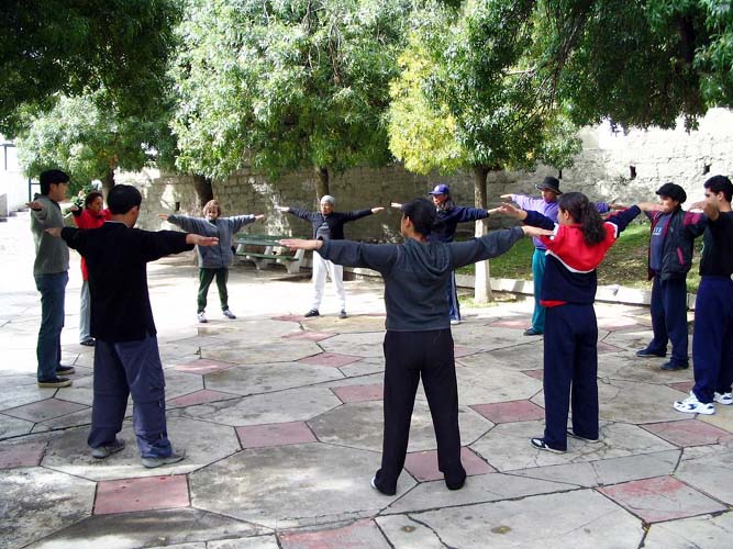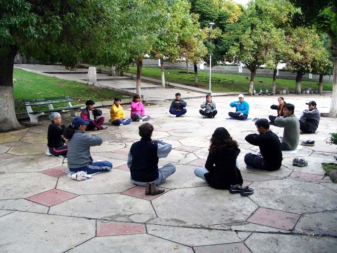 弗拉迪米尔过去曾在拉巴斯市中心的艾瓦诺阿广场(La Plaza Avaroa)每天与本地的武术爱好者在此地耍刀弄棒,我们到达的第二天(2月7日)早上九点到广场时,十几个有缘人已经在此等候了。当和我们一起随着炼功音乐作着舒展,大方的动作,平静祥和的正念之场深深的吸引着这些有缘人。炼功结束后,他们纷纷要求明天继续学炼法轮功。