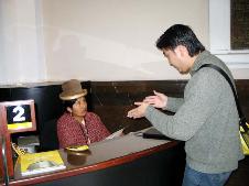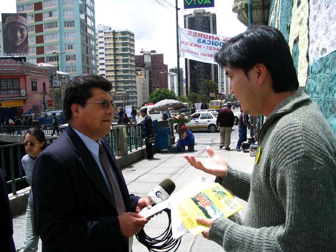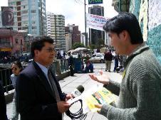 2月10日,我们走访了拉巴斯市政厅,向市政厅的有关人员递交了法轮大法的真象资料。市政厅内的工作人员纷纷向我们索取大法真象传单。询问炼功点的情况,表示要去学炼法轮功。下午,“理报”(La Razon) 报社的体育栏目记者听了我们讲真象后,表示要把我们的报导介绍到其他栏目中。
