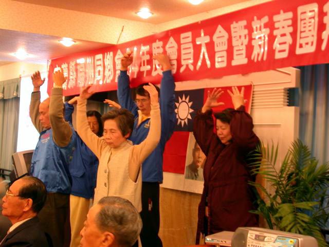 同乡会会员报到时,现场播放新!唐!人:电视台2005年全球华人新年晚会台北场次的集锦30分钟。因受场地限制,约有二十位宜兰县学员参与演示五套功法,动作整齐优美、音乐悠扬柔和,博得来宾一致好评。功法表演前由学炼多年的慧灯中学洪校长简单介绍法轮功,包括:注重心性修炼的功法特点,已洪传六十多国、使全球一亿多人身心受益,遭中共江氏集团迫害及近年海外多国诉江的概况。洪校长特别推崇法轮功以“真、善、忍”为本,提升道德,强身健体,其净化人心、福国利民之卓著功效已获世界各国一千三百多项褒奖。