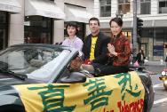 * 市议员乘坐贴有“法轮大法好”横幅的座车参加游行