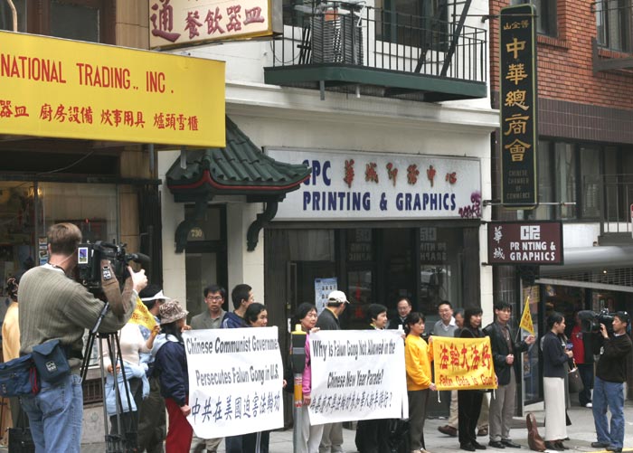 旧金山中华总商会是华人新年游行的主办机构。其部份主要成员与中共关系密切。游行数周前,旧金山中华总商会屈服于中领馆的压力,无理拒绝了法轮功学员的游行申请。