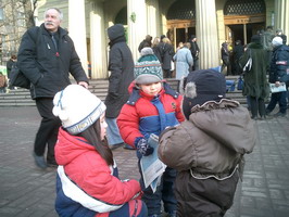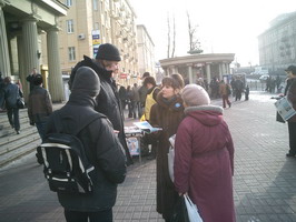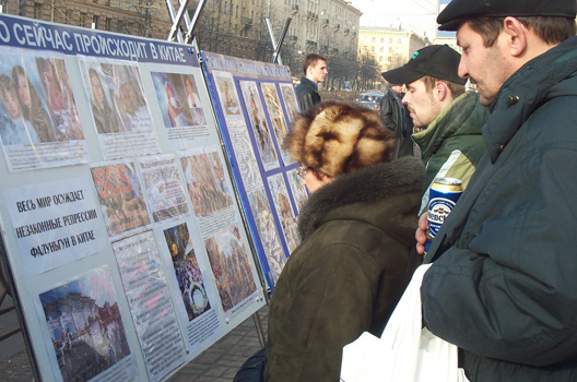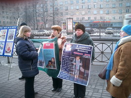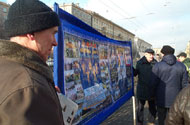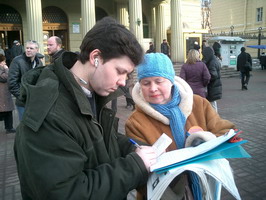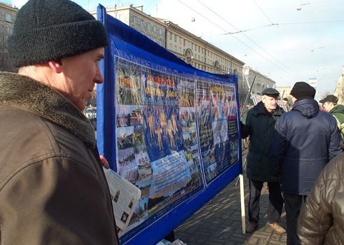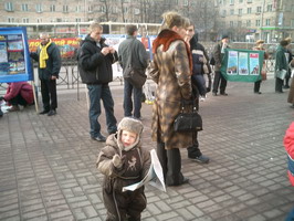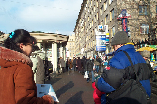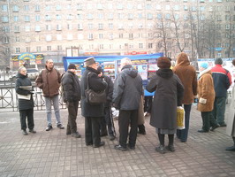 【明慧网2005年2月22日】2005年2月19日这天,圣彼得堡的天气少有的晴朗。俄罗斯法轮功学员们在“阿夫多瓦”地铁站举行集会,向人们讲述中共法轮功的真象及法轮大法在世界洪传的盛况。很多从地铁口進出的行人都走上前来向学员询问什么是法轮功,并对法轮功学员创作的美术作品非常感兴趣。而更多的人看到揭露在中国正发生着对法轮功学员的迫害的部分图片感到非常震惊。