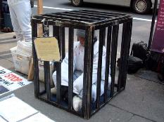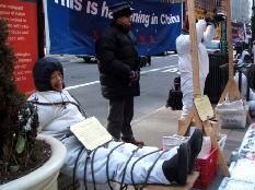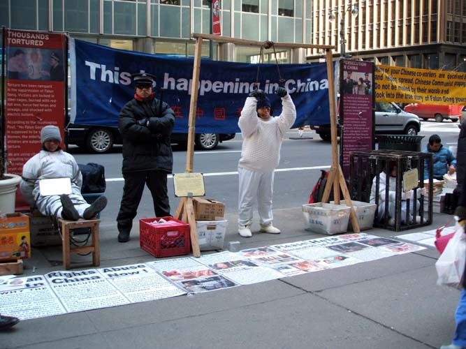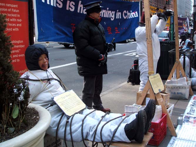 【明慧网2005年2月24日】2005年1月20日,奥地利法轮功学员在维也纳的史蒂芬广场(Stephans platz)举办了反酷刑展及法轮大法信息日活动。反酷刑展中,法轮功学员以真人模拟的方式展示了很多被中共江氏集团用来强制法轮功学员放弃他们信仰的酷刑手段。这些酷刑的模拟可以使更多的人看清在中共前领导人江××命令下正在发生的恐怖罪行。同时,也使人们進一步认识对以“真、善、忍”法理为生活准则的法轮功学员的酷刑及虐杀,本质上是对人类道德与正义的直接侵犯。
