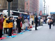 学员们向路人发送法轮功简介以及迫害真象的材料,并和路人交谈。在了解真象后,很多人在呼吁终止中共群体灭绝法轮功的请愿文件上签名。