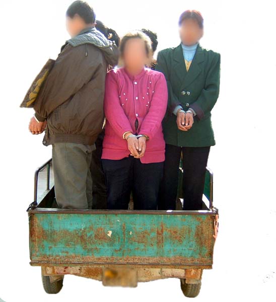 3、1999年12月,寿光县王望乡镇委人员将全镇6名大法弟子戴上手铐,胸前挂着大牌子,用汽车拉着,围着乡镇村游街。