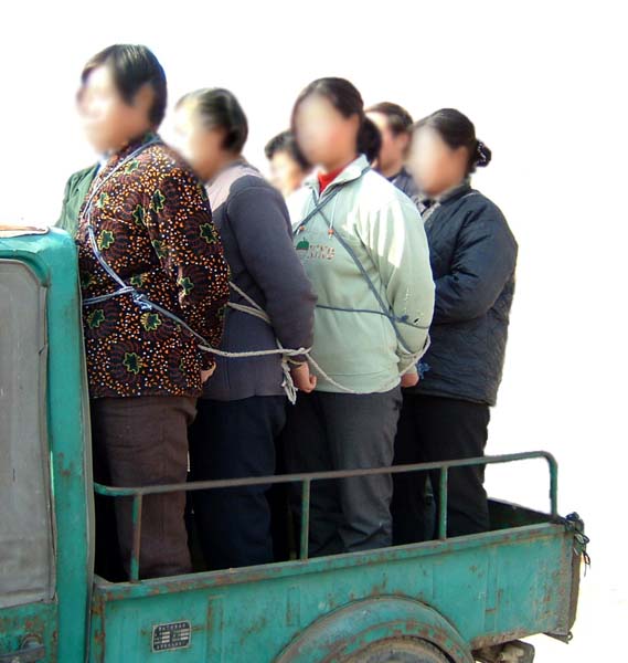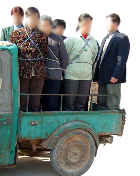 4、1999年10月,寿光县公安局将全县大法弟子用大汽车拉着游街示众(将非法治安拘留的戴手铐,由一人押着;将非法刑事拘留的用绳子五花大绑由二人押着;然后将他们用绳子串联起来)。
