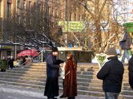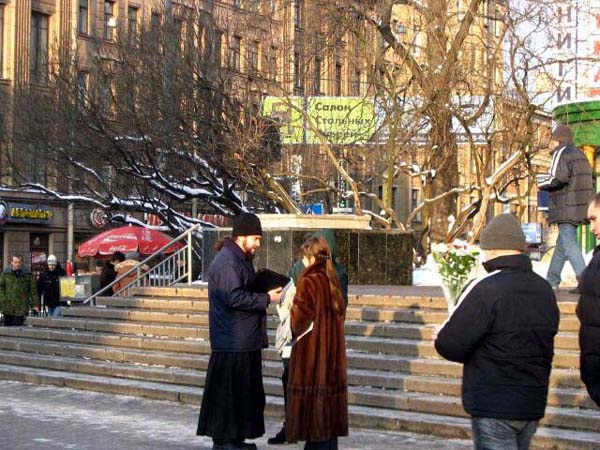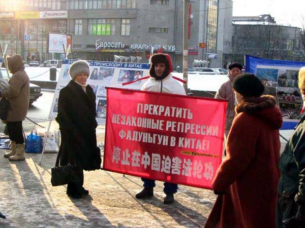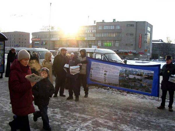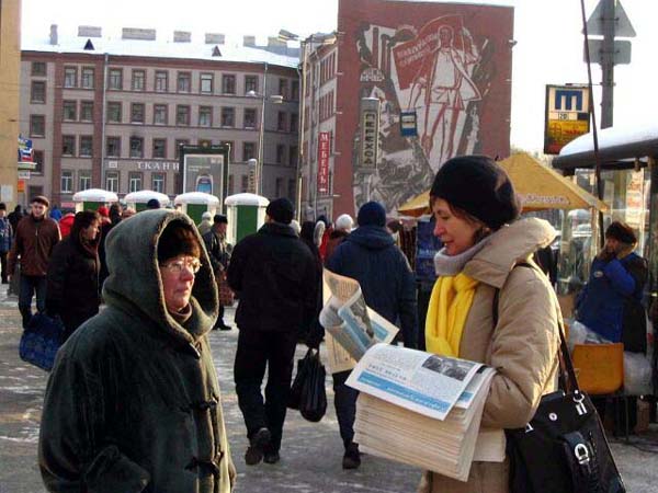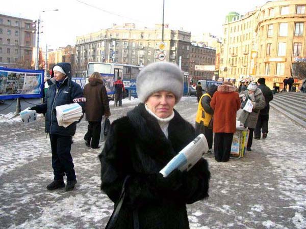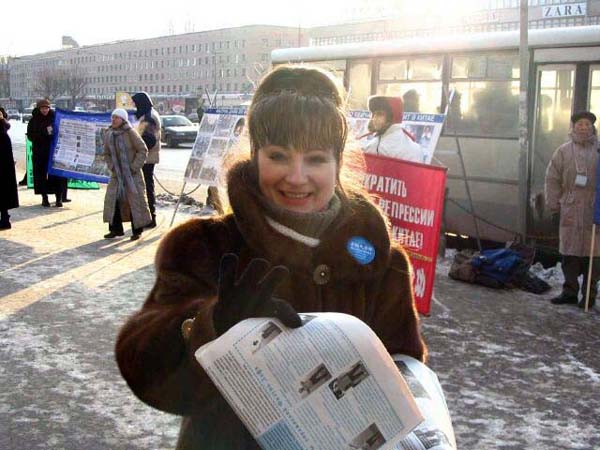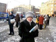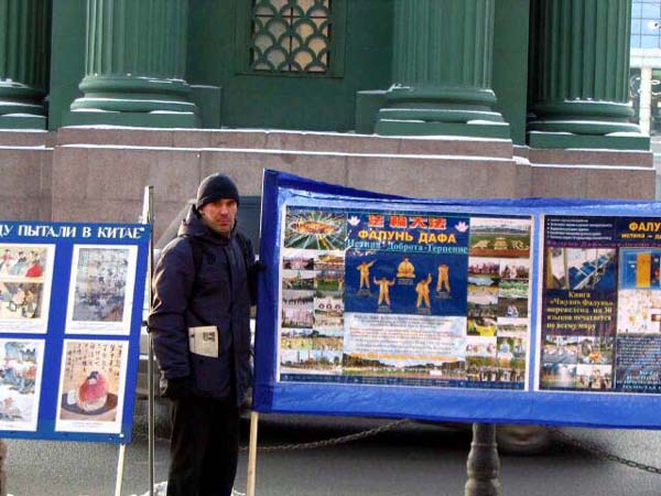 有位男士来到这里。以前,当学员们在佛教寺院里讲真象时曾和他见过面,他就是这座庙里的住持。他有一段很特殊的经历,几年前他得了严重脚关节病,医生都没有办法给他治愈。他以很大的毅力和求生的愿望,一个人跑到了原始森林深处,那里仅有三户人家。他在那里自己搞出一种治病的方法,还学会了种庄稼。凭着他坚强的信念和毅力,三年后他的脚病好了,回到了彼得堡。近来他的手关节又病了,今天他来到了法轮功学员们集会的地方。他对学员认真的说:“这一切都不是偶然的,是命运让我知道了法轮大法,把我带到了你们这里来的。真的应该认真想一想啊!”