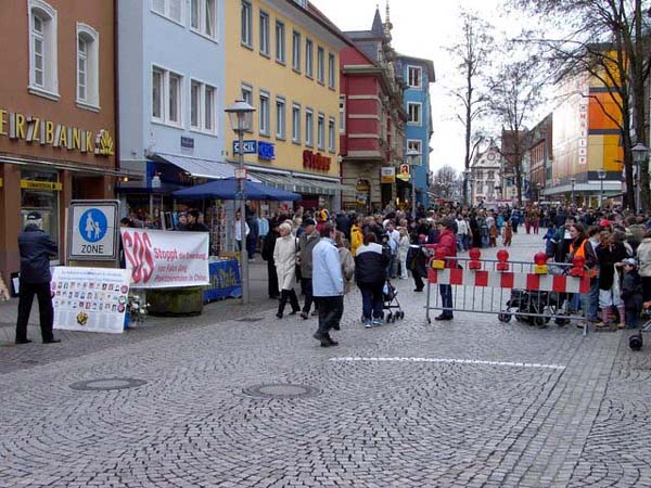 【明慧网2005年2月5日】2005年1月1日,在德国欧芬堡(Offenburg)的年度狂欢节游行中(Popular Mardi Gras Parade),法轮功学员设立了一个信息展位,使人们得以了解中共江氏集团对法轮功的残酷。现场有数千名观众,信息展位就在大批拥挤的人潮中,而且学员还举办了展,示范中共江氏集团用以迫使法轮功学员放弃信仰的各种酷刑手段。许多路人停下来安静的观看酷刑展。他们看到法轮功学员在中国遭受到如此残酷及无人性的违反人权待遇,显得很震惊。