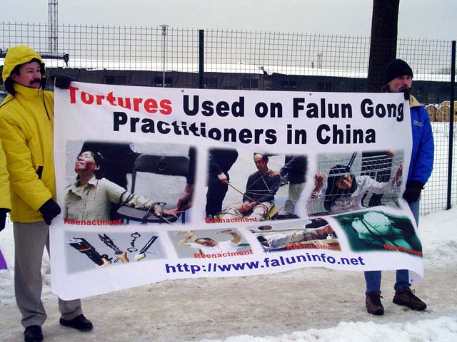 学员们举着印有英文“中国发生的对法轮功学员的酷刑”横幅