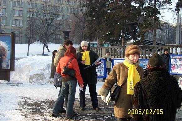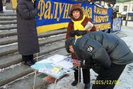 今天莫斯科的气温在零下20摄氏度,连续四个半小时学员们打着中俄文的横幅和真象展板:“法轮大法”;“真善忍”及“至今在中国已有1375名大法学员被迫害致死”;“立即停止在中国迫害法轮功!”学员们在广场的每个街口处向过路人发放真象资料和讲真象,还不断的用扩音喇叭向路人讲清真象,呼吁立即停止在中国迫害法轮功。