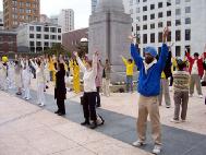 ![]() 主持人雷宁 | ![]() 集会现场 | ![]() 示范功法 |