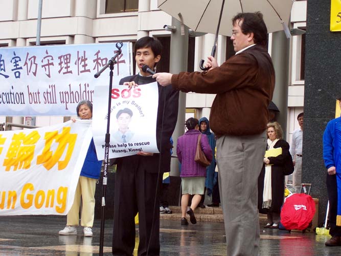 随后,李祥春的未婚妻符泳青讲述了李祥春回中国大陆告诉人们真象被非法逮捕的经过,她呼吁人们继续对此关注,并伸出援救之手,营救李祥春回家。王意群女士在谈到被中共残酷迫害,许多法轮功学员被迫害致死,他们的遗孤,有很多流离失所,所以也希望善良的人们能帮助营救这些孤儿。美国乔治亚州居民黄万青博士讲述了弟弟黄雄因修炼法轮功,2003年4月被非法被抓,现仍无下落,他感谢国会议员和美国政府的努力。他要求中国政府立即释放黄雄和所有被中共关押的法轮功学员。