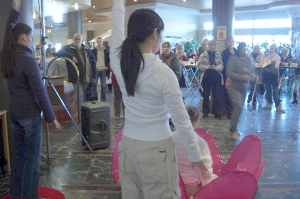 博览会开幕后,参观者开始涌入。许多人好奇的参观法轮功学员的展位以及观看教功录像,每个人都想拿纸莲花,学员们向参观者说明莲花出淤泥而不染,在淤泥满布的水池中坚忍不拔成长,伸出水面并盛开纯洁无瑕的美丽花朵,这也象征修炼的过程。学员也说明法轮功是一项修炼功法,修炼者努力同化“真、善、忍”。