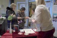 法轮功学员们带来的纸莲花,将分送给参观者;另外,他们还带来了以布制作的莲花以及罩子装饰展位。在墙壁上,学员们放了三个展板,上面有“真善忍”的字样。瑞典文译本的《法轮功》新版书籍也摆放在展位上。