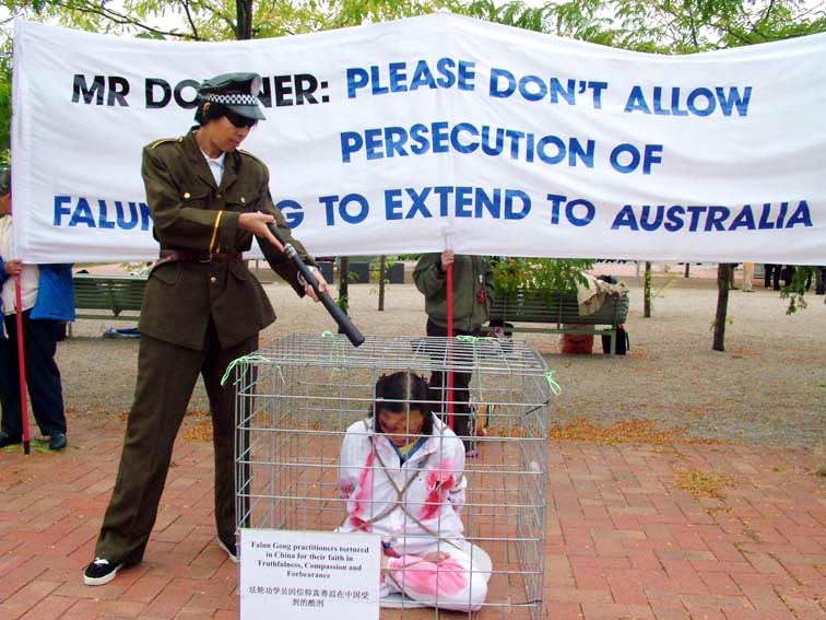 ![]() 新闻发布会上法轮功发言人约翰•戴乐发言 | ![]() 堪培拉外交部前举行了反酷刑展 |