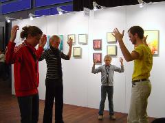 虽然我们的展台不大,但安排却有“奇妙”之处。在我们展台的左前方,正好有一块没有人利用的空地,这就理所当然的成了我们展示功法的好地方。于是,我们讲真象,发资料,即时教功的范围自然的扩展到展台之外。在展台的电视里不断的穿插播放着师父的教功录像和真象录像的同时,弟子们分工有序,或发资料,或与人们交谈,或者在声音调到不影响别人的炼功音乐声中静静的演示功法。