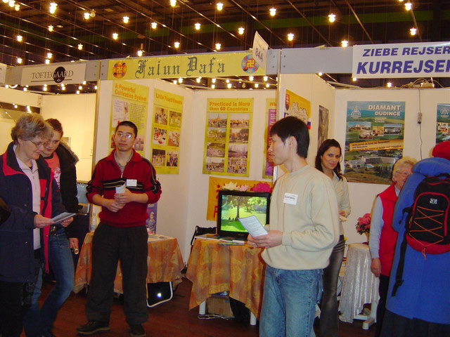 许多的人得了一份学员递上的资料后,还要一份,说是为了给朋友。有的人主动要资料。许多人驻足在电视机前,看录像,许多人被学员优美,舒展的炼功场面所吸引,久久不愿离去。一位女士连连赞叹道:真美!真美!许多人当场学功,并询问炼功的时间,地点和联系方法。一些其他展位的办展人也趁空隙时间主动前来了解法轮功。这是在丹麦文《法轮功》一书出版后的第一次办展活动。人们有的当场买书,有的要去了出售大法书籍的书店地址,表示会先到我们的丹麦文网页去认真了解,再做决定。