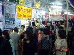 ![]() 金灿灿“法轮大法好”横幅高挂在展位中间 | ![]() 在法轮功学员展位前驻足观看、咨询者异常踊跃 |