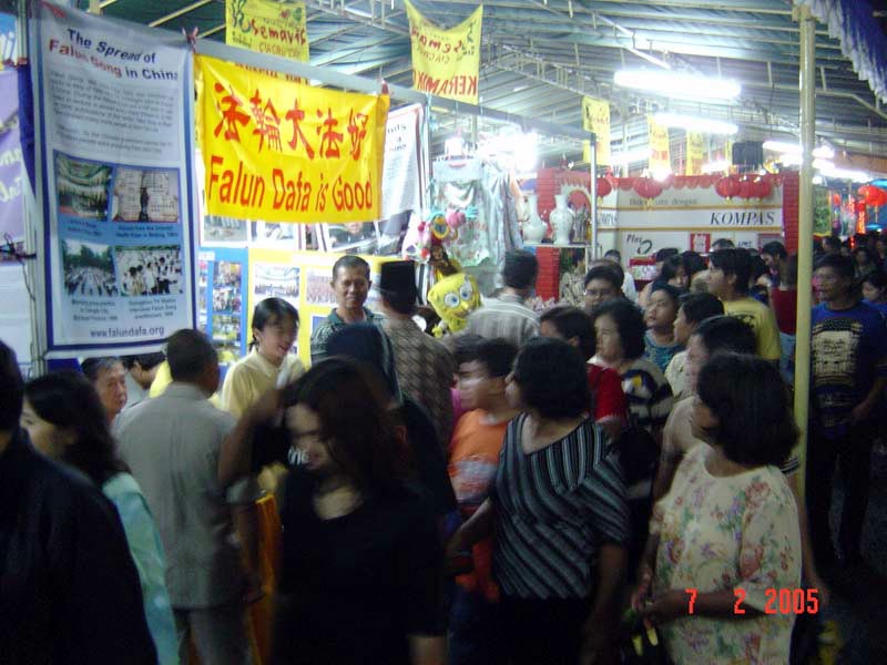 有一个展位显得与众不同,从它的外观、装饰、摆设,甚至工作人员,都异于一般的展位,十分吸引人。一幅金灿灿“法轮大法好”大型横幅高挂在展位中间,四壁挂满数百张反映法轮大法洪传世界和洪传印尼的图片,其中包括法轮大法在全世界获得的上千项褒奖,以及中国大陆法轮功学员因坚持修炼而被中共江氏集团残酷迫害、折磨致死的真实故事。那些令人震惊的故事收集在真象材料中,被大量分发给有缘了解法轮功的人们。