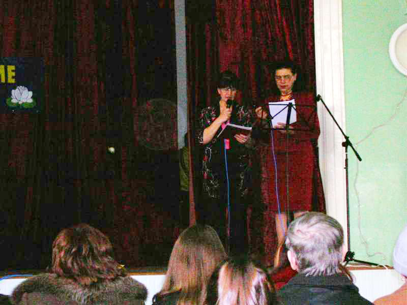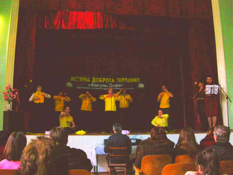 俱乐部的礼堂和舞台宽敞、明亮,很多人都应邀前来参观展览。学员们身着黄色的服装迎接来宾,带领他们参观,给人们讲解展板上的内容,并且还赠送给他们莲花。人们都非常的想了解中国的文化并对法轮大法很感兴趣。活动中学员们还表演了舞蹈、诗朗诵等。
