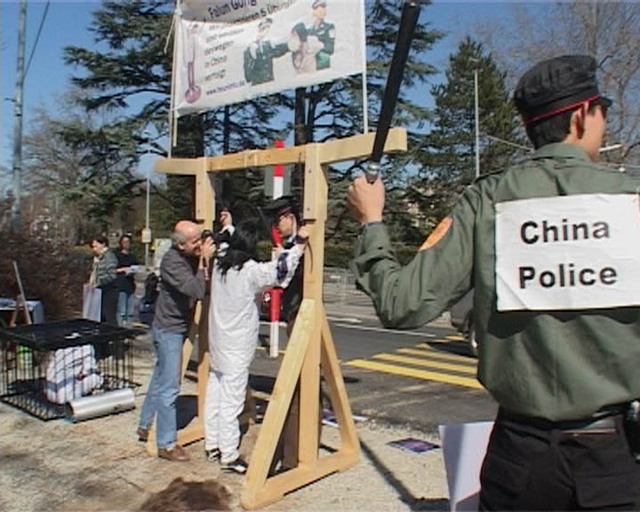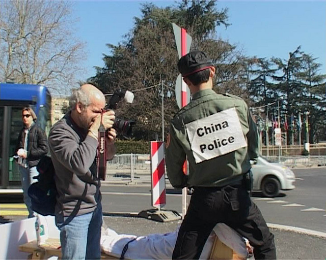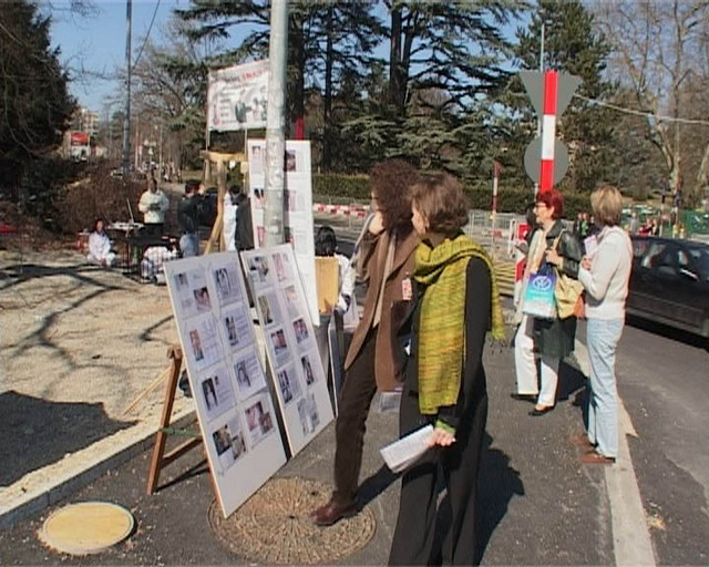 瑞士学员由全国各地纷纷涌向日内瓦,有的拉着道具驱车纵穿瑞士,早早赶到活动地点;有的带着还在吃奶的孩子也匆匆赶来。大家积极主动,配合默契,有的担任反酷刑展的演员,有的在路边向行人散发法轮功真象材料,有的在表演功法……