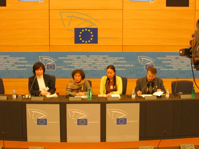 下午3点,亲身受过迫害的法轮功学员受邀参加记者招待会,临时得知消息的法国议员阿兰·里别兹(Alain Lipietz)也决定出席支持。席间有德国、比利时、法国等国家的新闻媒体和欧盟的亚洲研究学者等。整个记者招待会全程向每一位议员的房间的闭路电视现场直播。