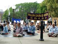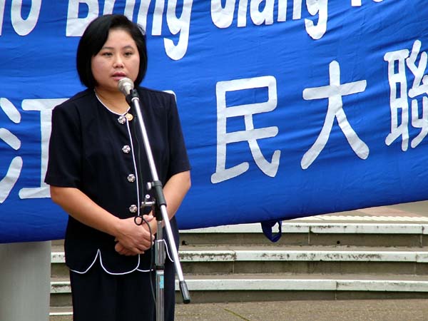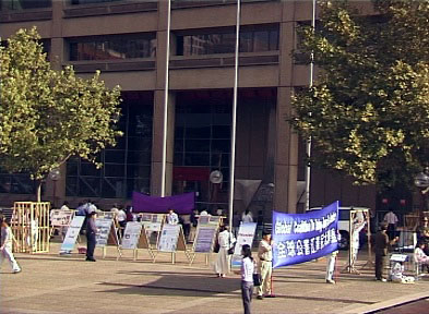 ![]() 纽省高院前的和平呼吁活动 | ![]() 集体炼功和反酷刑展 | ![]() 章翠英在新闻发布会上发言 |