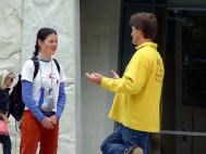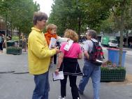 ![]() 在反酷刑展前逗留了两小时的女孩,在听完学员尼克讲解后,当即表示要学功。 | ![]() 洪法的小弟子 | ![]() 学员卡蒂在演讲 |