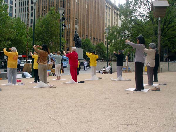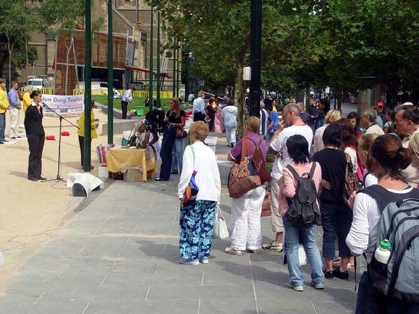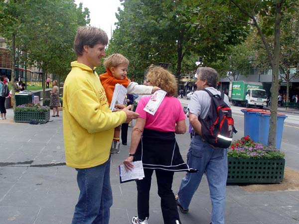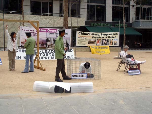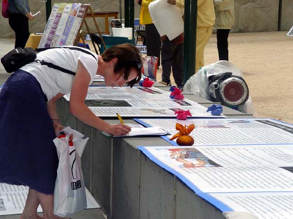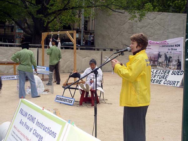 一位中学生激动的说,即使对小动物也不能这样,何况是人呢?一位中年男子看了酷刑演示及图片展后,缓缓的走向一位演示“吊刑”的学员,轻轻的拥抱了她;一位年轻姑娘在酷刑展上看了很久,迟迟不愿离去,当学员尼克跟她详细讲述法轮功真象后,她当即表示要学功。一位退休教师说:“我一直在关注法轮功。两年前当听说墨尔本华裔市长苏某某不让你们参加蒙巴节游行时我就很生气,我曾打电话去市政厅质问他们。后来法轮功将这事告到‘公平委员会’并得到公正的结果,即市政厅公开在三大报纸上道歉。他们应该明白这里是澳洲,不是中国。”一位在民族电视台作制片的女士看完反酷刑展后非常震惊,她说:“我一定要将你们的故事搬到电视上去。”还有一位公司老板跟学员说这样的事必须立刻停止,并说他想捐5万块钱来帮助法轮功……