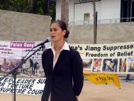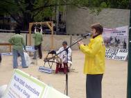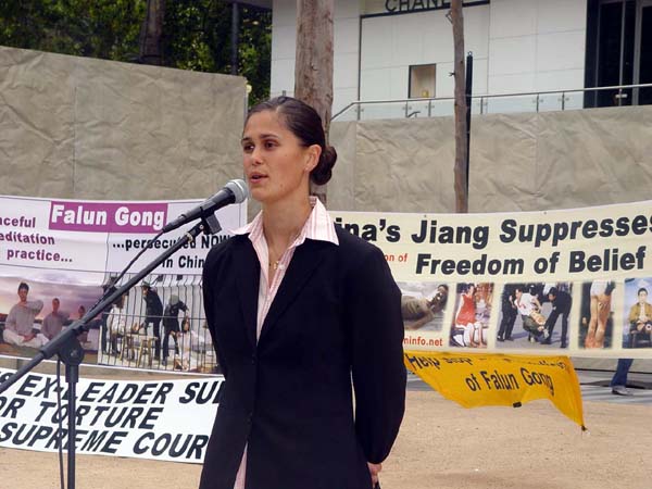 学员卡蒂和凯特是两妯娌,在整个反酷刑展中一直轮流在麦克风前跟大家讲解法轮功是什么,中共为什么要迫害法轮功。尤其是凯特在麦克风前一站就是两小时,不停的讲述着。她是36位去天安门打“真、善、忍”横幅的西方学员中的一位,她的亲身经历打动了在场所有人的心。