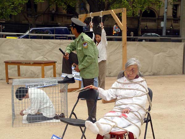 反酷刑展由四个部分组成,即:酷刑展示、五套功法表演、真象图片展及“和平花瓣”工艺台。整个场面非常壮观,尤其是真人模拟酷刑演示令人触目惊心,与优美祥和的五套功法表演形成了强烈的对比,震撼了每一位过路人的心。人们纷纷驻足观看,他们中有在市中心上班的白领阶层,有世界各地来墨尔本观光的游客,还有成群结队的中学生……大多数人都表示,在二十一世纪的今天,中共统治下的中国仍然发生这样惨无人道的事情实在让人震惊,无法接受。