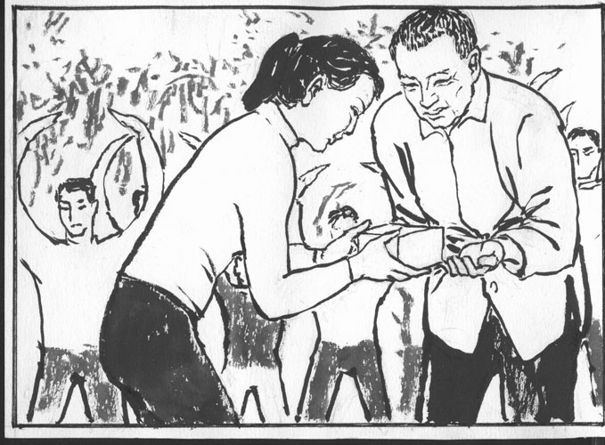 10、第七天,我父亲就高高兴兴的去炼功点学炼动作,第九天就回来教妹妹炼功了。