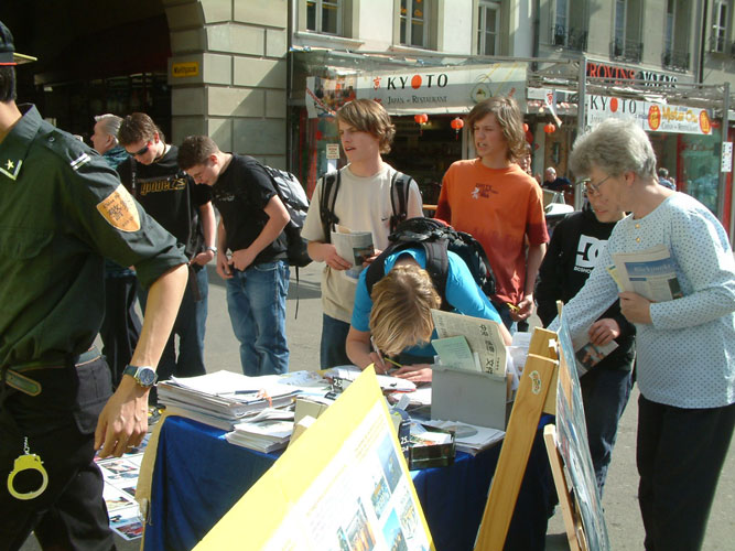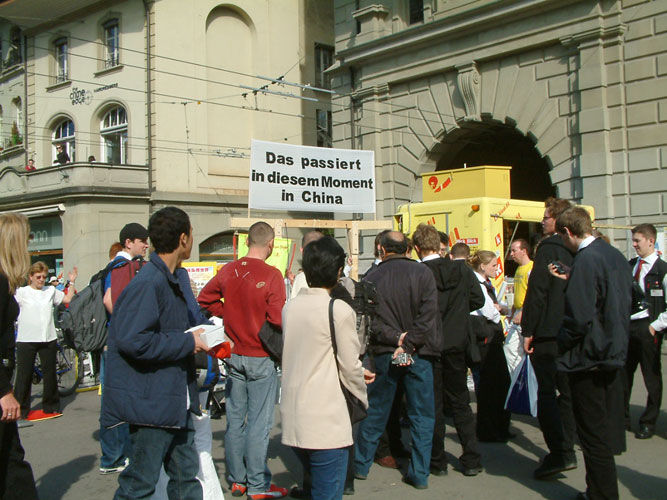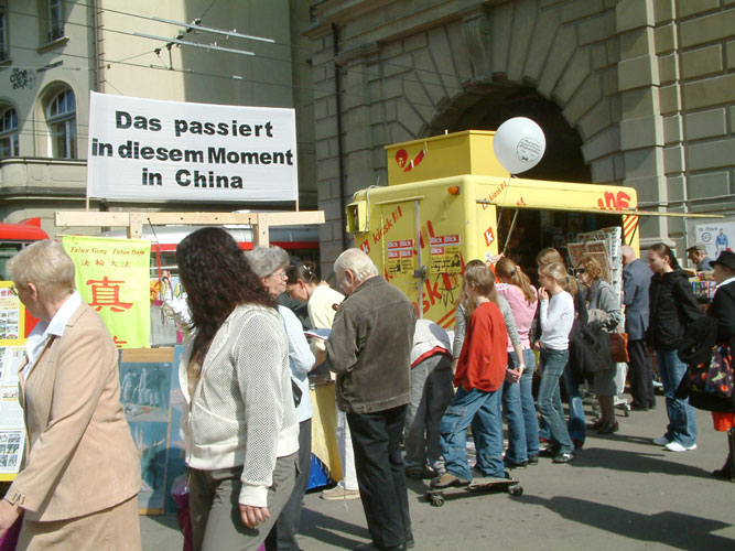 是日,天气晴朗,温暖宜人,人们纷纷走向街头。首先映入人们眼帘的是大型横幅“这是正发生在中国的事情”。人们络绎不绝的涌向展位,观看模拟的反酷刑展和揭露中国法轮功学员受迫害的图片展板以及五套功法的演示。有的仔细的观看展板并听学员讲真象达2-3小时。
