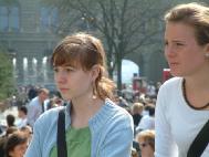 两名妇女一直在听学员们讲真象,索取了各种材料并签名,对法轮功表示了极大的同情和支持。其中一名女士,大声的对挥舞着警棍的警察的扮演者说,“放下你的警棍不要再打那位女士(指扮演被迫害的学员)。我难过极了,真的,我心里难过极了,怎么能如此践踏人权!”