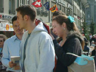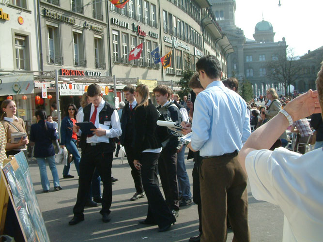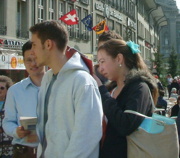 一群衣着笔挺的青年,来到展位前,明白真象后十分震惊,都签了名表示对法轮功的支持。他们说,他们是来参加国际职业比赛的,也有中国人参赛。学员问他们可否把知道的法轮功的真象告诉参加比赛的中国人,他们异口同声的说:愿意。并索取了一些中文真象材料和光盘,表示要去送给来参赛的中国人。