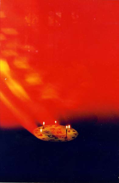(一)一九九七年农历四月初八的下午,几位法轮大法弟子在一同修家给师父庆祝生日,在炕上摆好了生日蛋糕,点燃了蜡烛。一位大法弟子在生日蛋糕前打坐并拍照留念。照相机拍下了这奇异的景象: