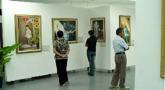 ![]() 画展开幕剪彩 | ![]() 参观画展的人们 |